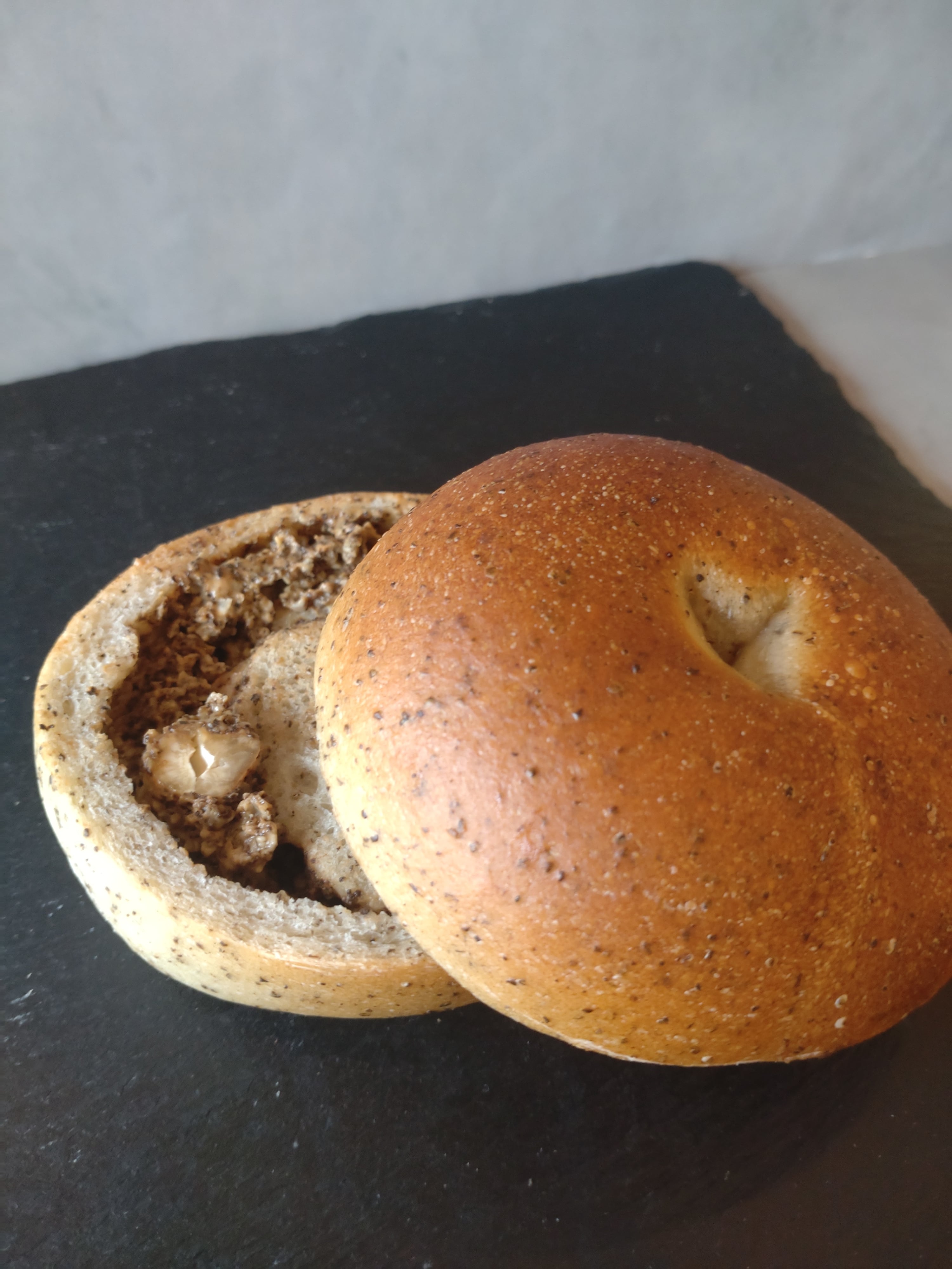 アールグレイ茶葉を練り込んだ生地に、甘さ控えめのミルクティークリームとラムレーズン、ローストカシューナッツを巻き込みました。